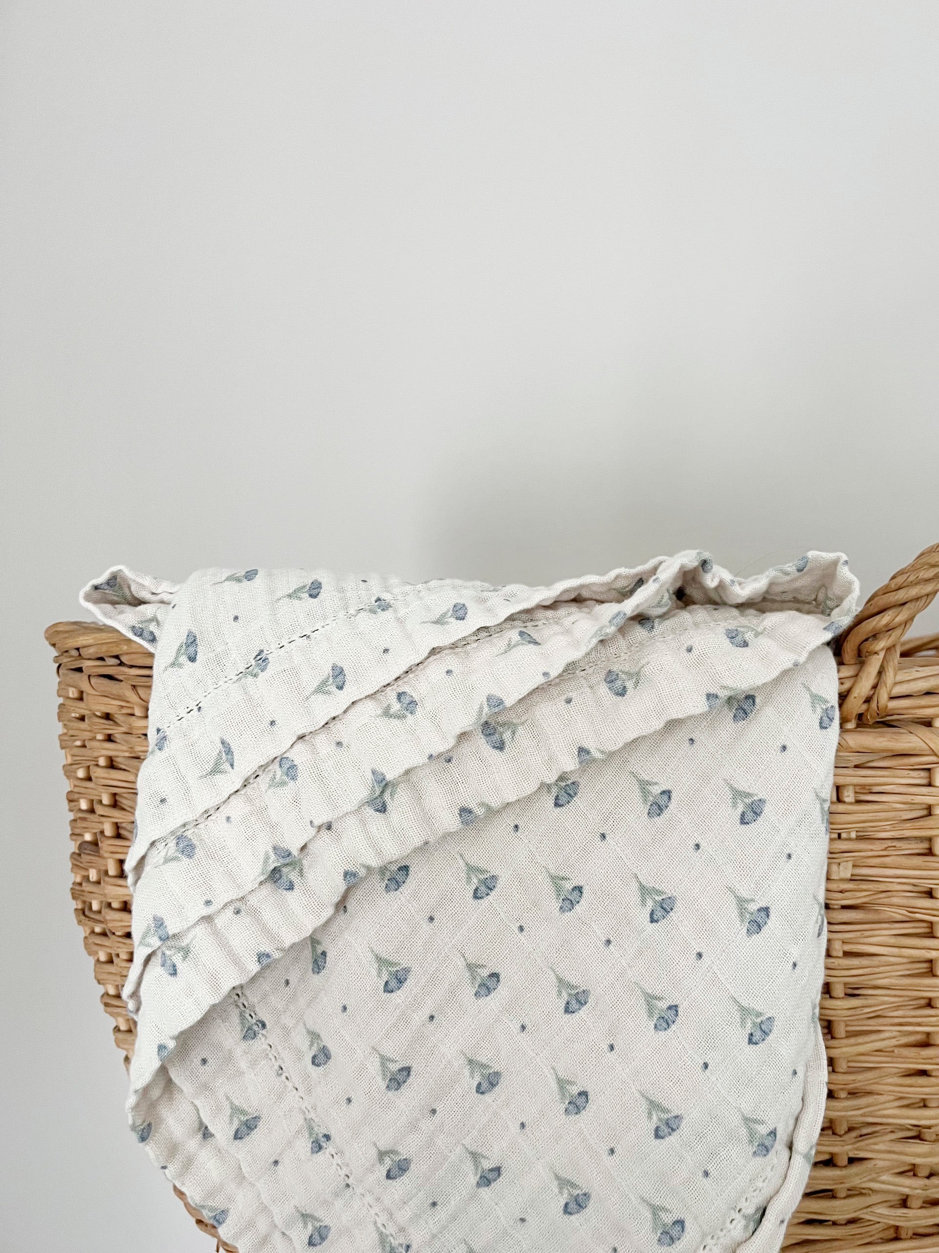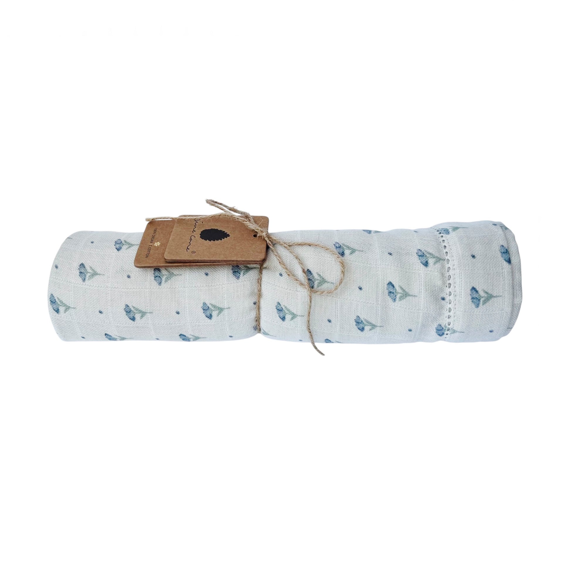 Dette smukke babysvøb har den fineste hulkant og er vævet i 100% blødt økologisk bomuld. Pak din nyfødte baby ind for at skabe tryghed og lad dit barn vokse med svøbet som kan bruges når de varme sommernætter melder sig eller bare som en dejlig stor nusseklud.